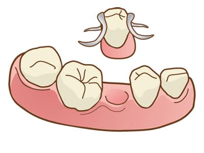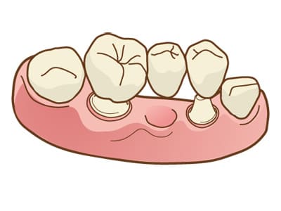 ブリッジとは、失った歯の両隣にある歯を支えとして利用し、人工の歯を固定する治療法です。装置はしっかりと歯に固定されるため取り外しの必要がなく、自然に近い噛み心地で、日常生活でも違和感が少ないという特徴があります。一方で、ブリッジを装着するためには支えとなる両隣の歯を削る必要があるほか、人工歯を支える役割を担うため、これらの歯に通常よりも大きな負担がかかることがあります。